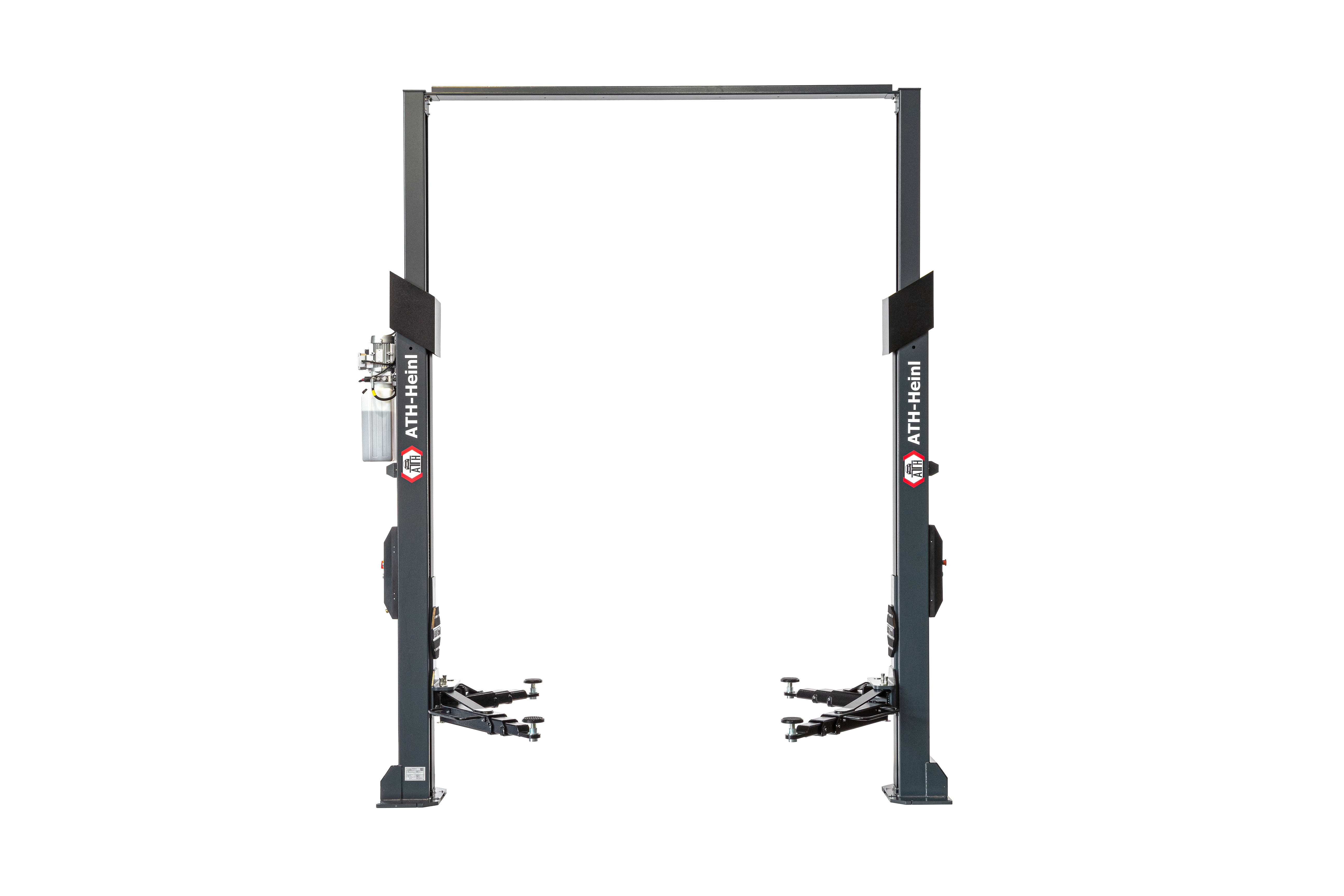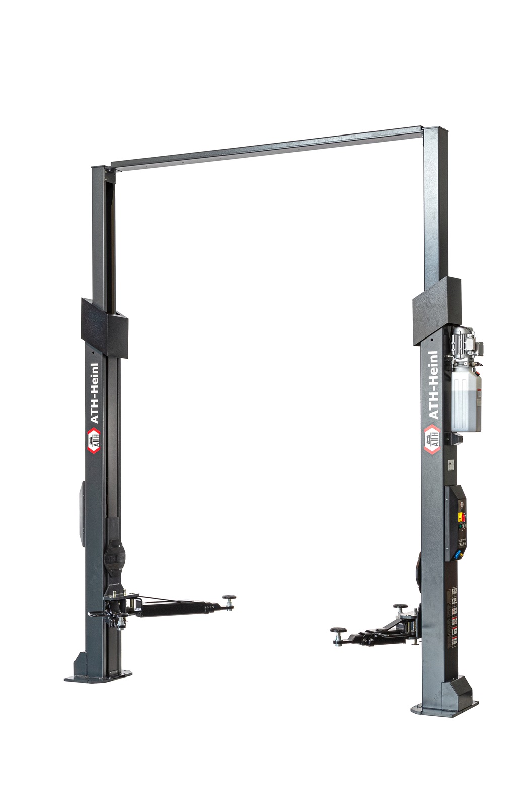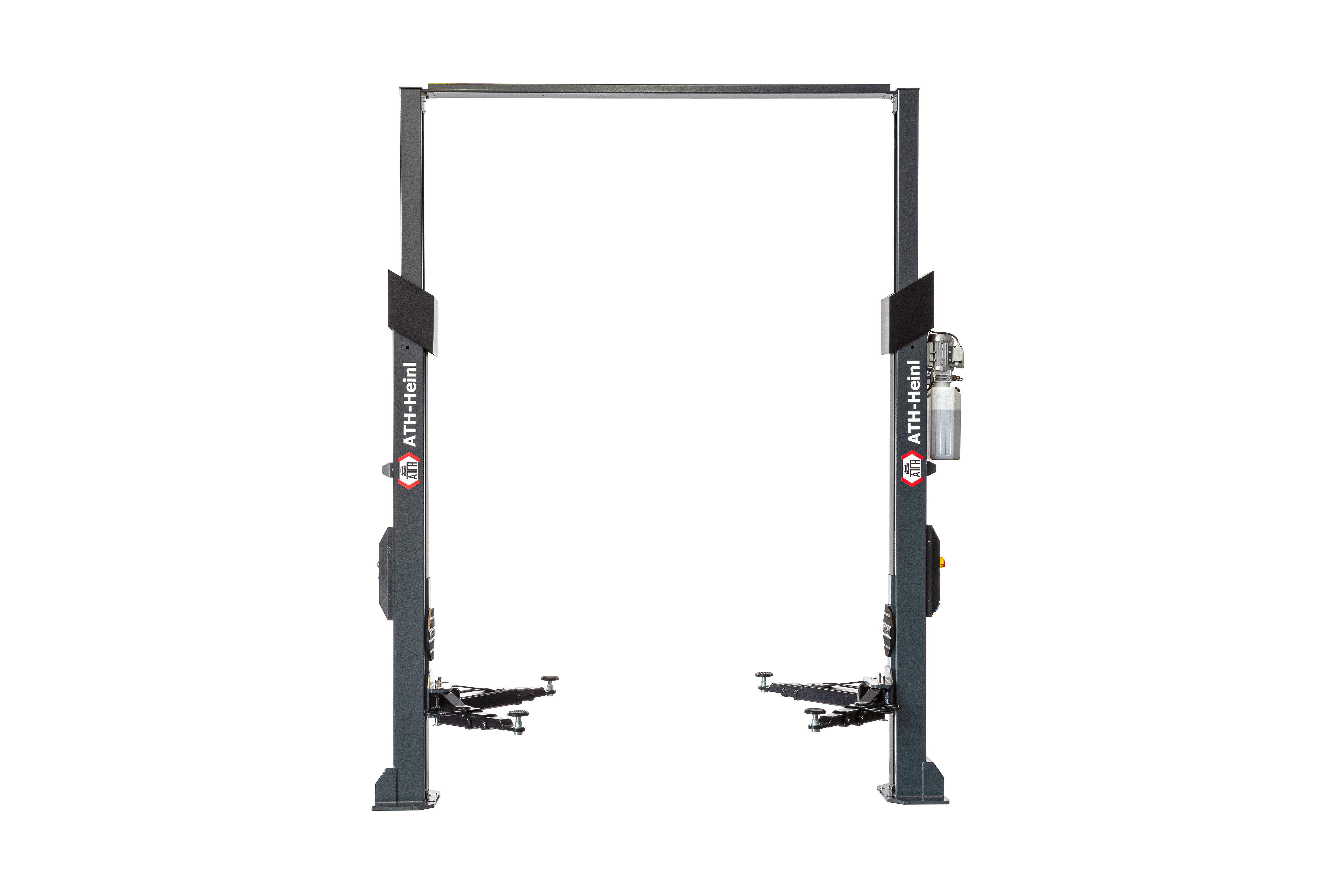 - Electro-hydraulic 2-post lift with quick lift unit and load-dependent lowering function