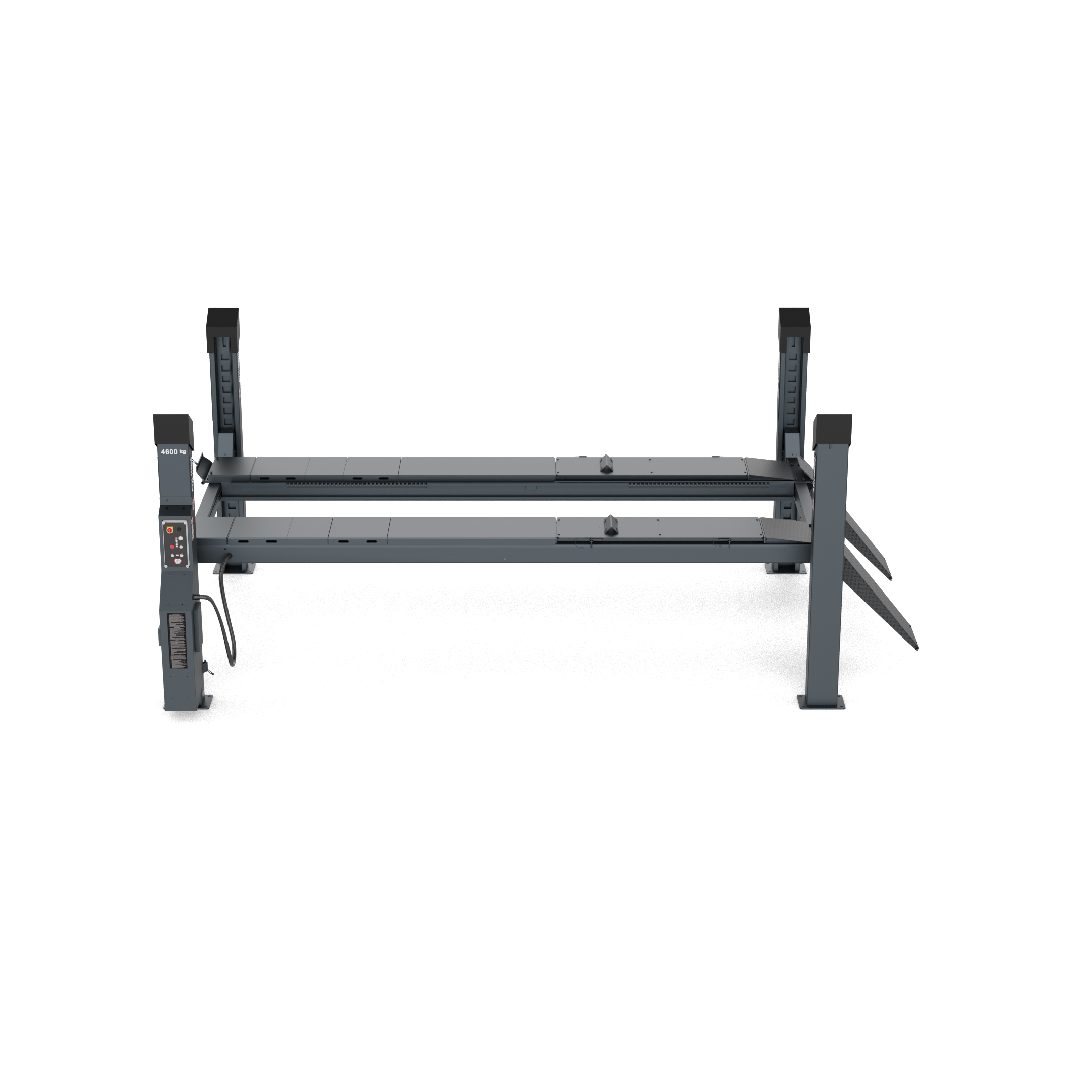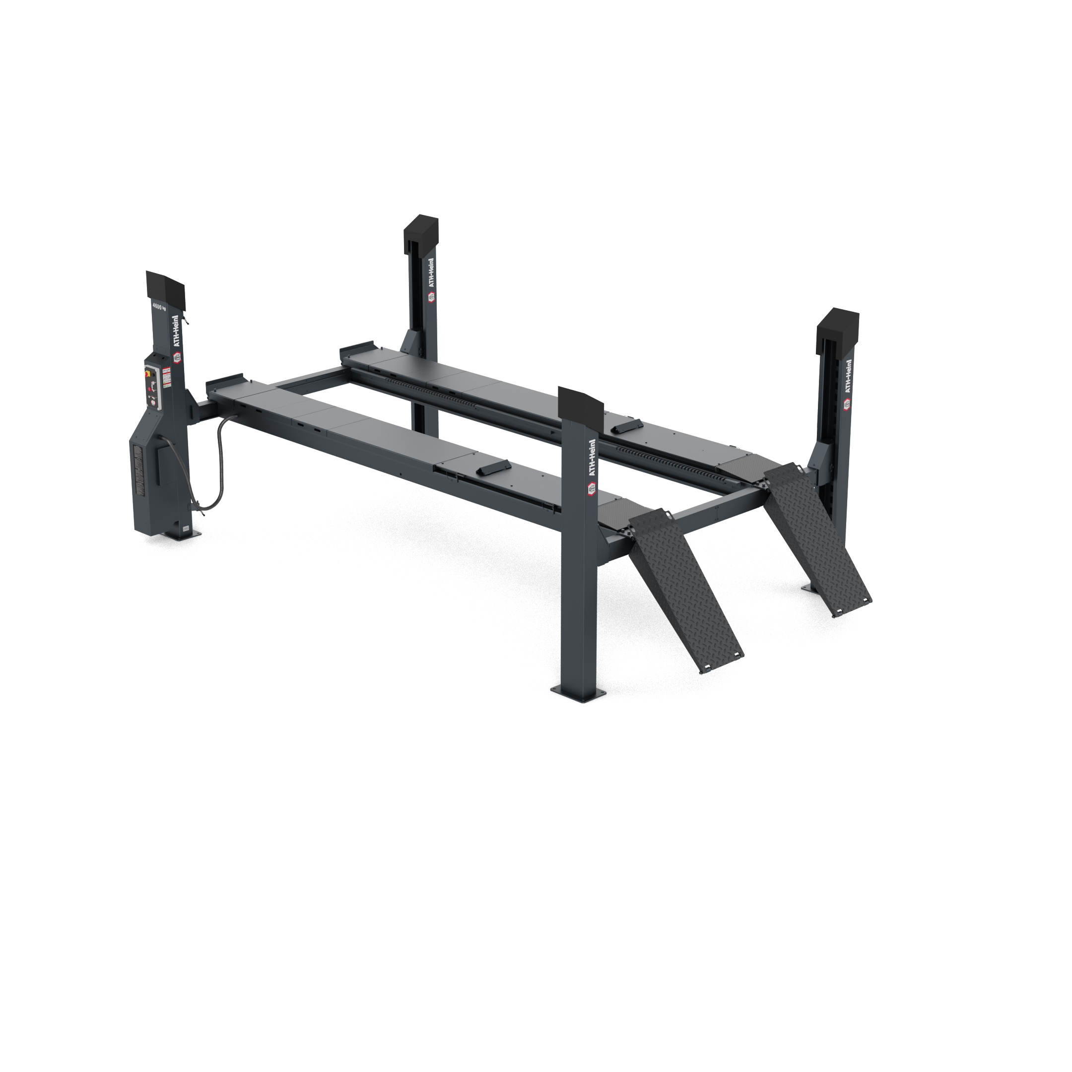 - Electro-hydraulic 4-post lift with quick lift unit and load-dependent lowering function