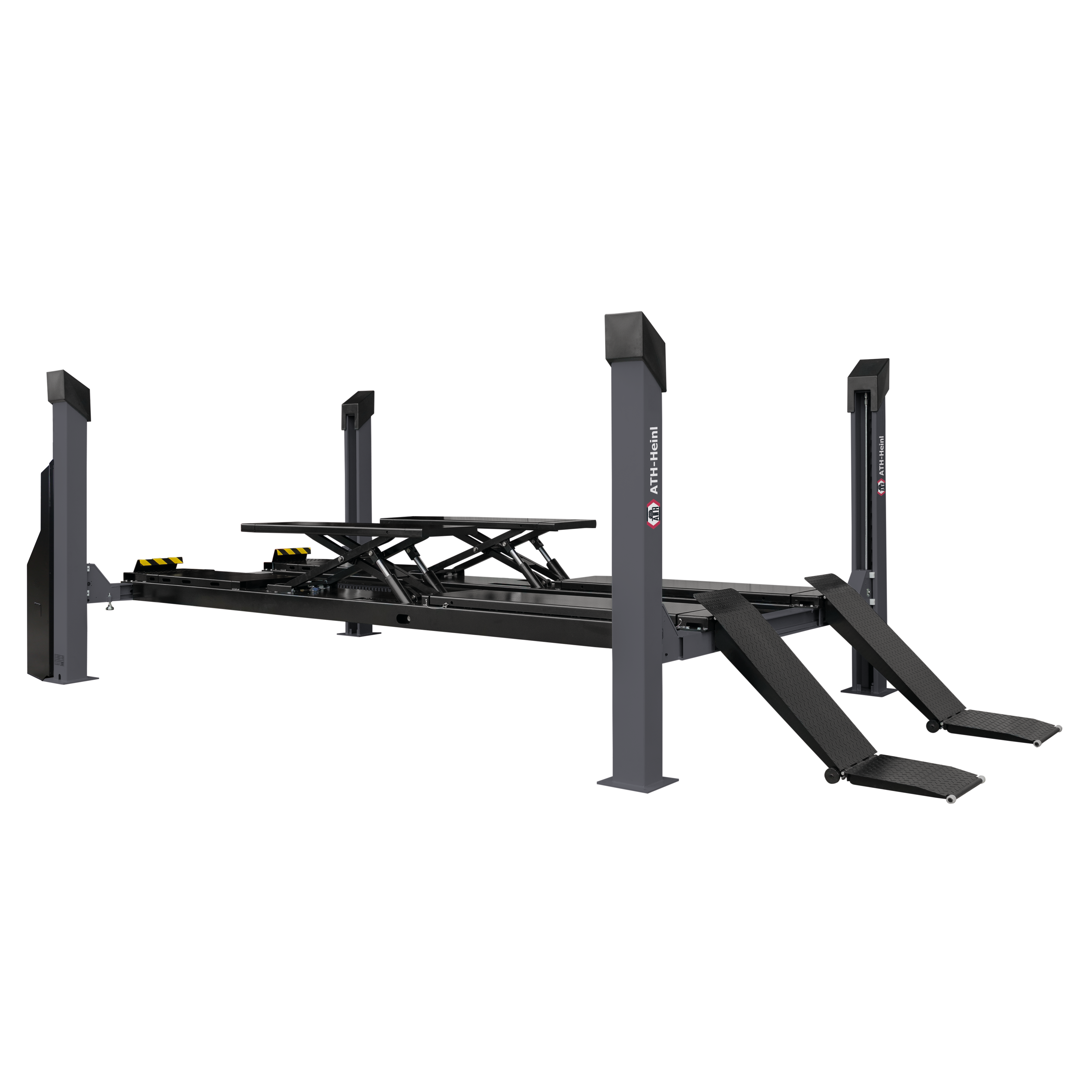 Perfect lift for wheel alignment with recess for turn plates in the front and already installed sliding plates in the back; also perfect for headlamp beam setting due to the notch system for adjusting the platforms